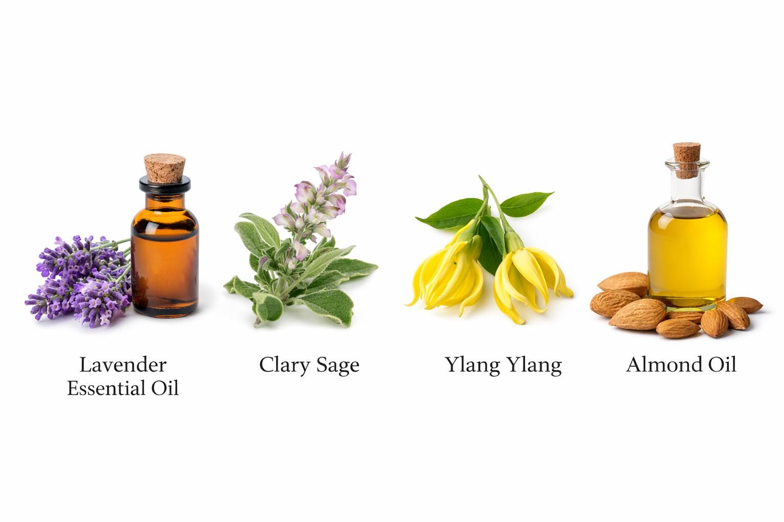 Sweet almond oil, lavender essential oil, clary sage essential oil, ylang ylang essential oil