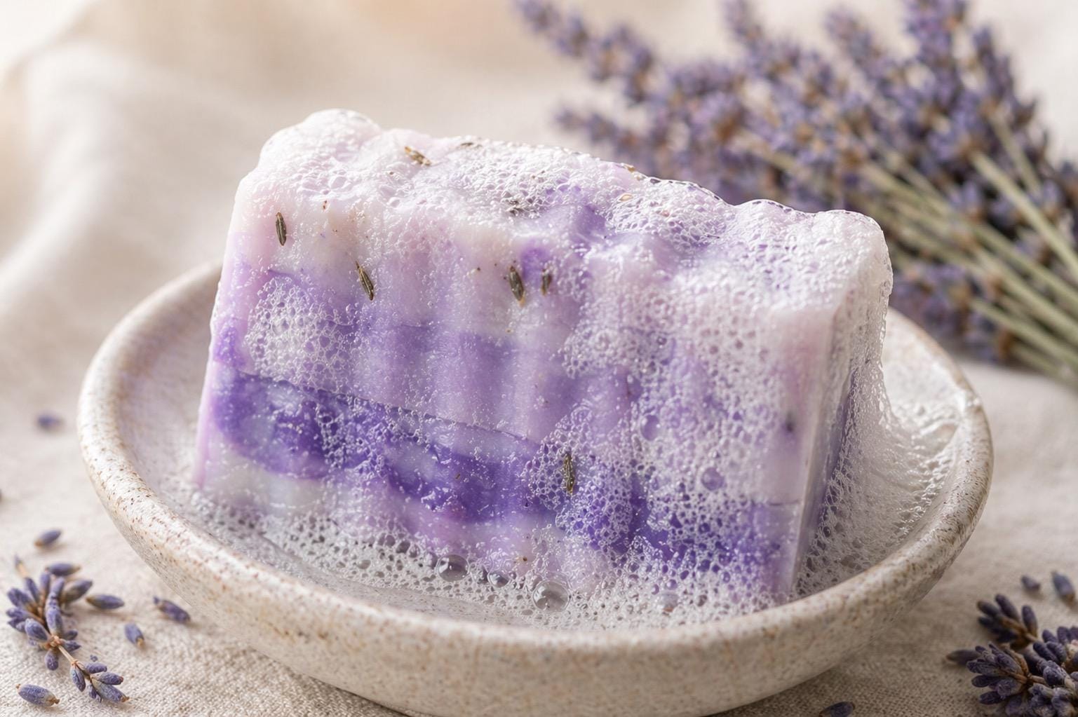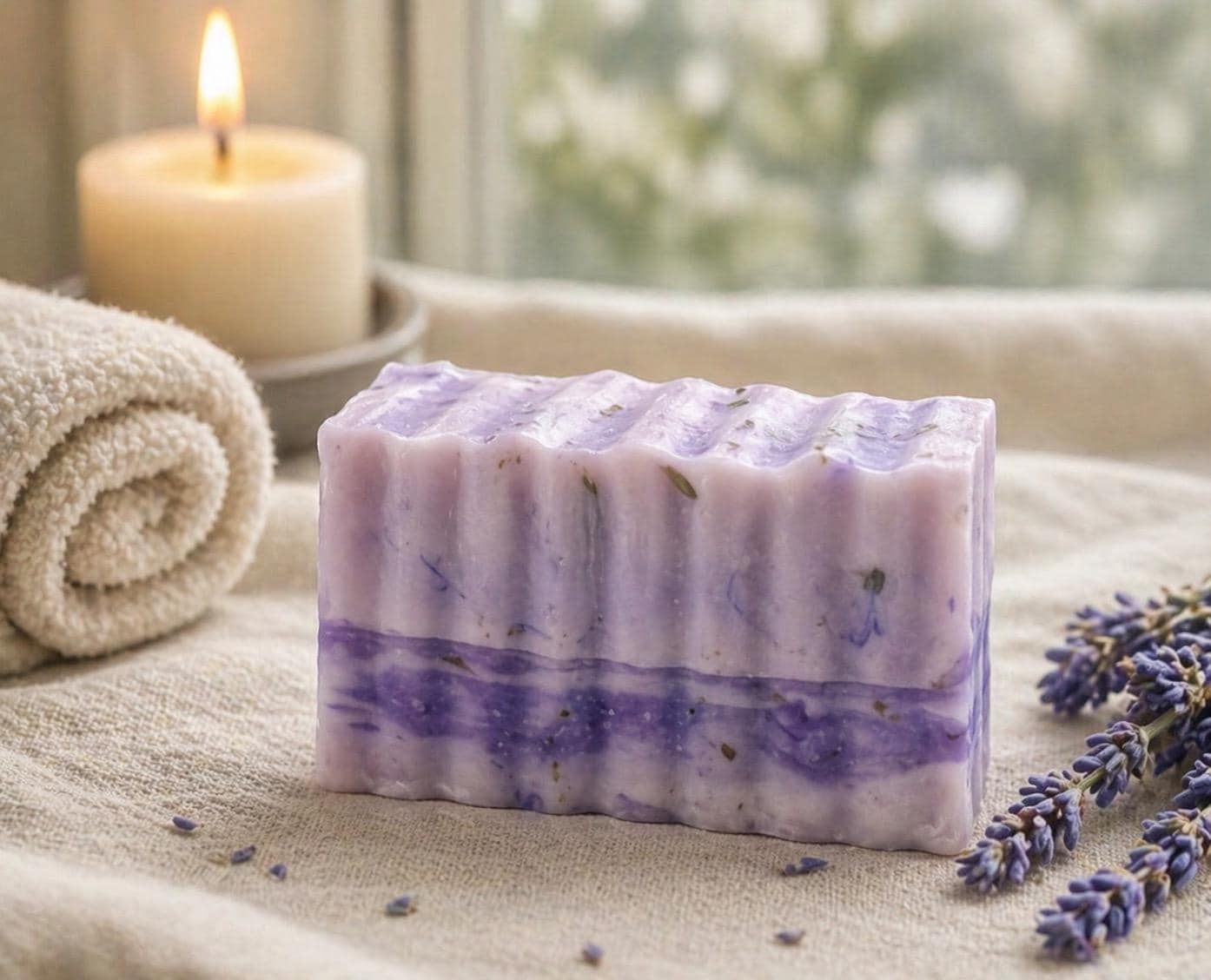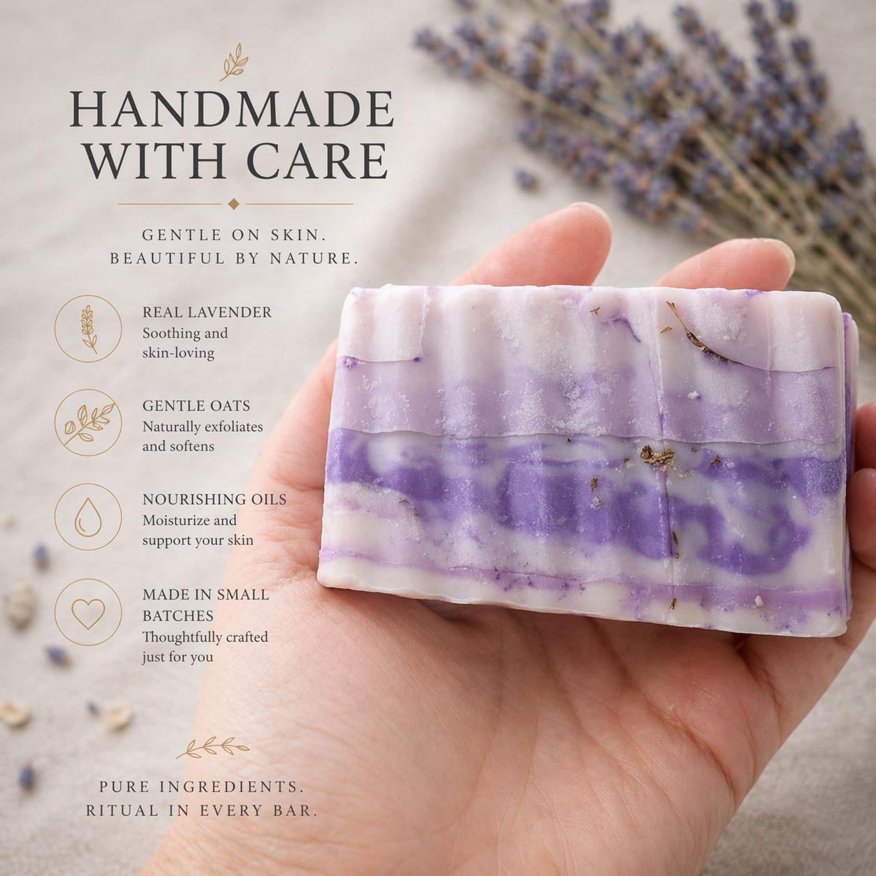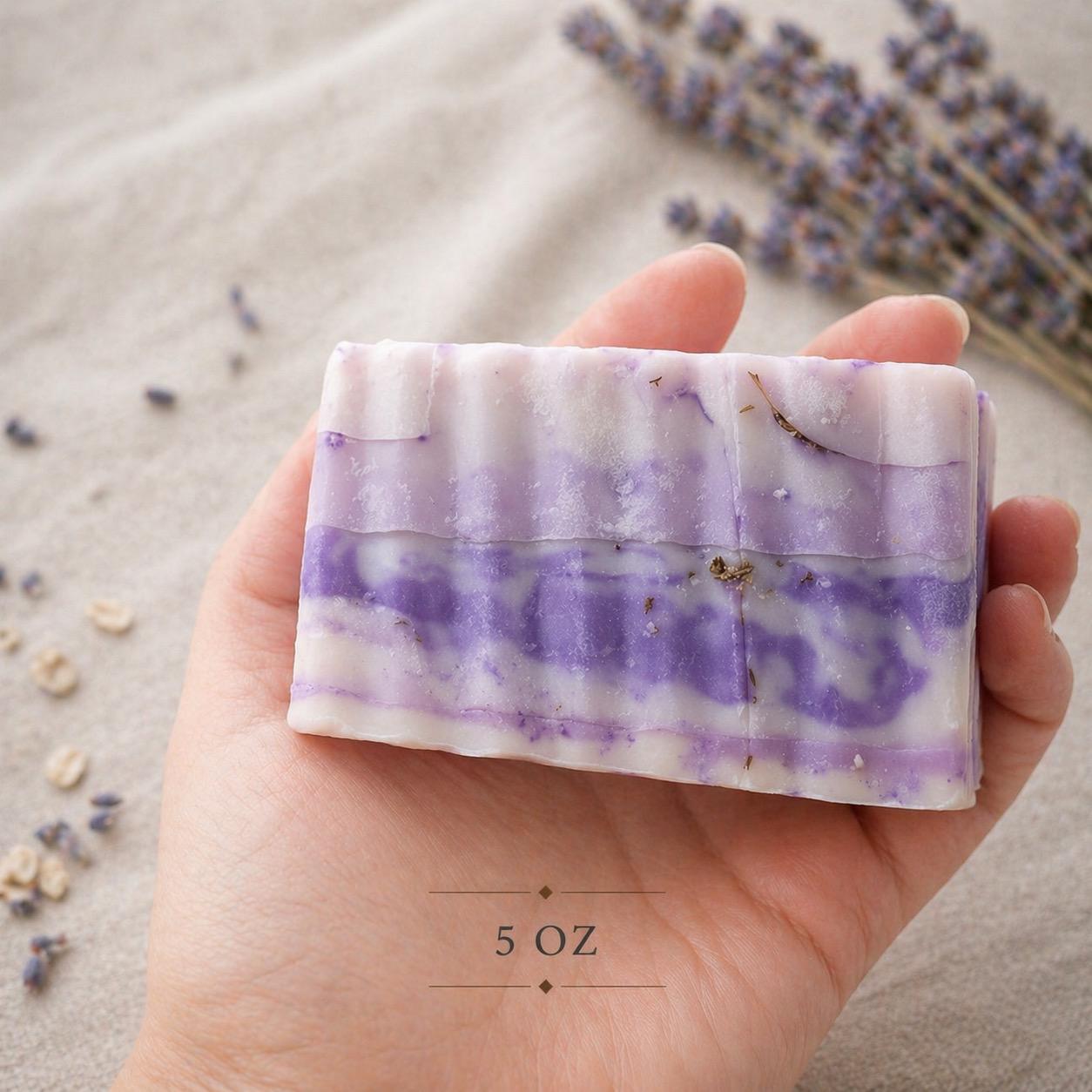 This lavender oatmeal soap is a gentle, soothing body bar designed for sensitive, dry, or easily irritated skin.