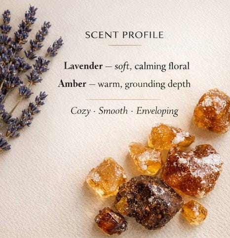 The gentle floral calm of lavender meets the deep warmth of amber, creating a scent that feels like dusk light, stillness, and emotional ease.
