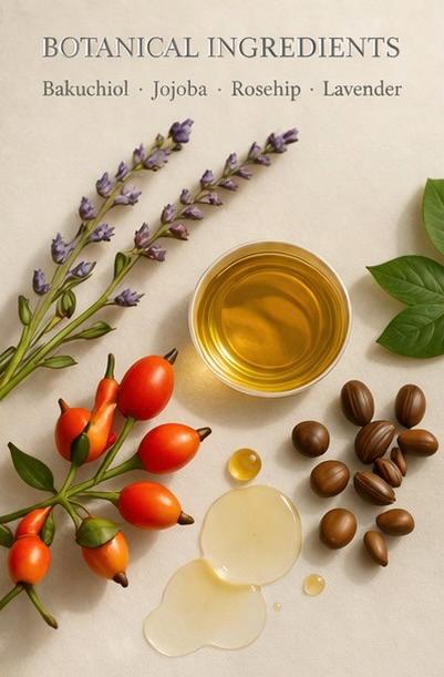 A lightweight botanical facial oil crafted with bakuchiol — a plant-based alternative traditionally used in place of retinol — to support the appearance of smooth, balanced, and luminous skin.