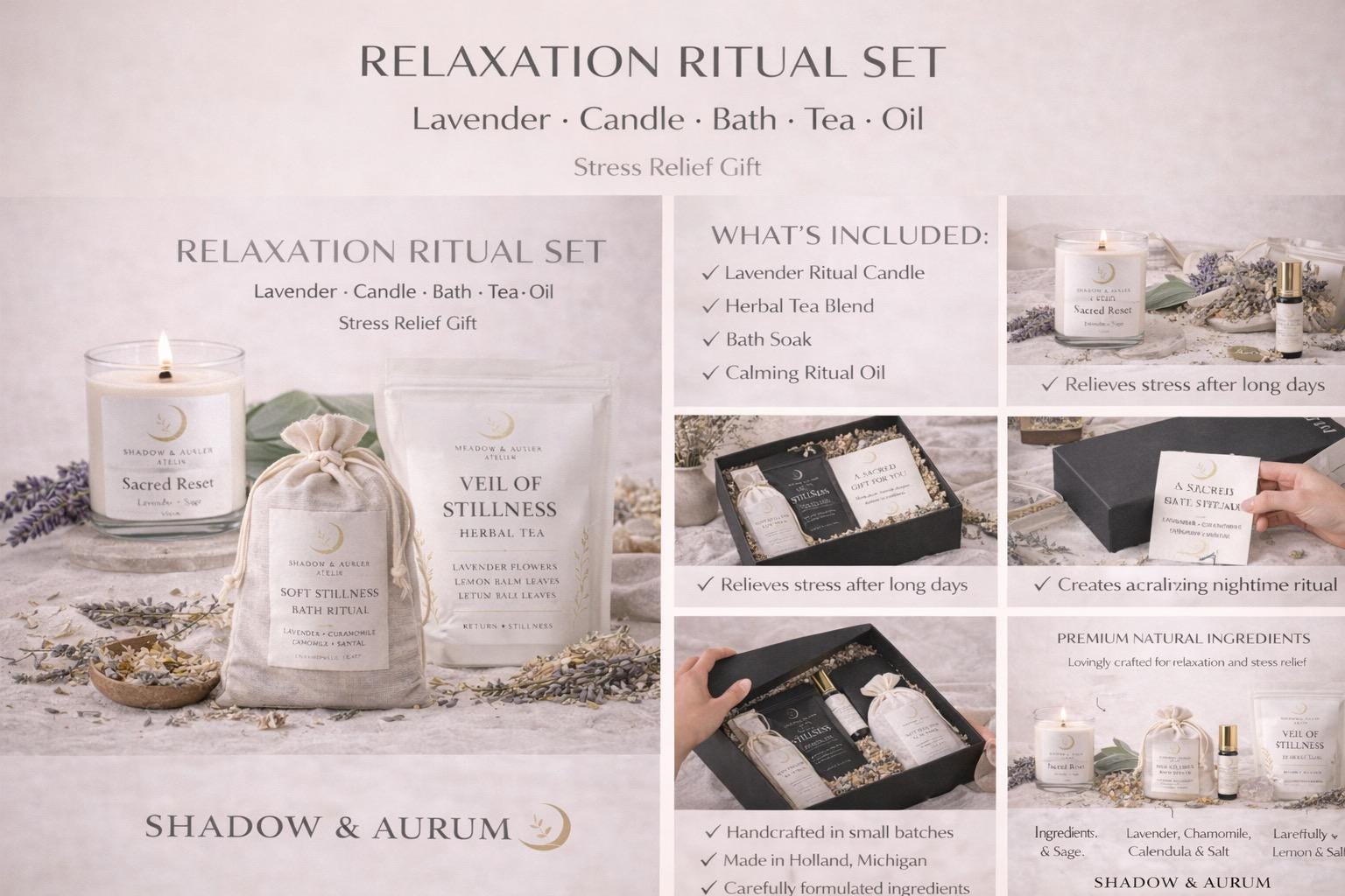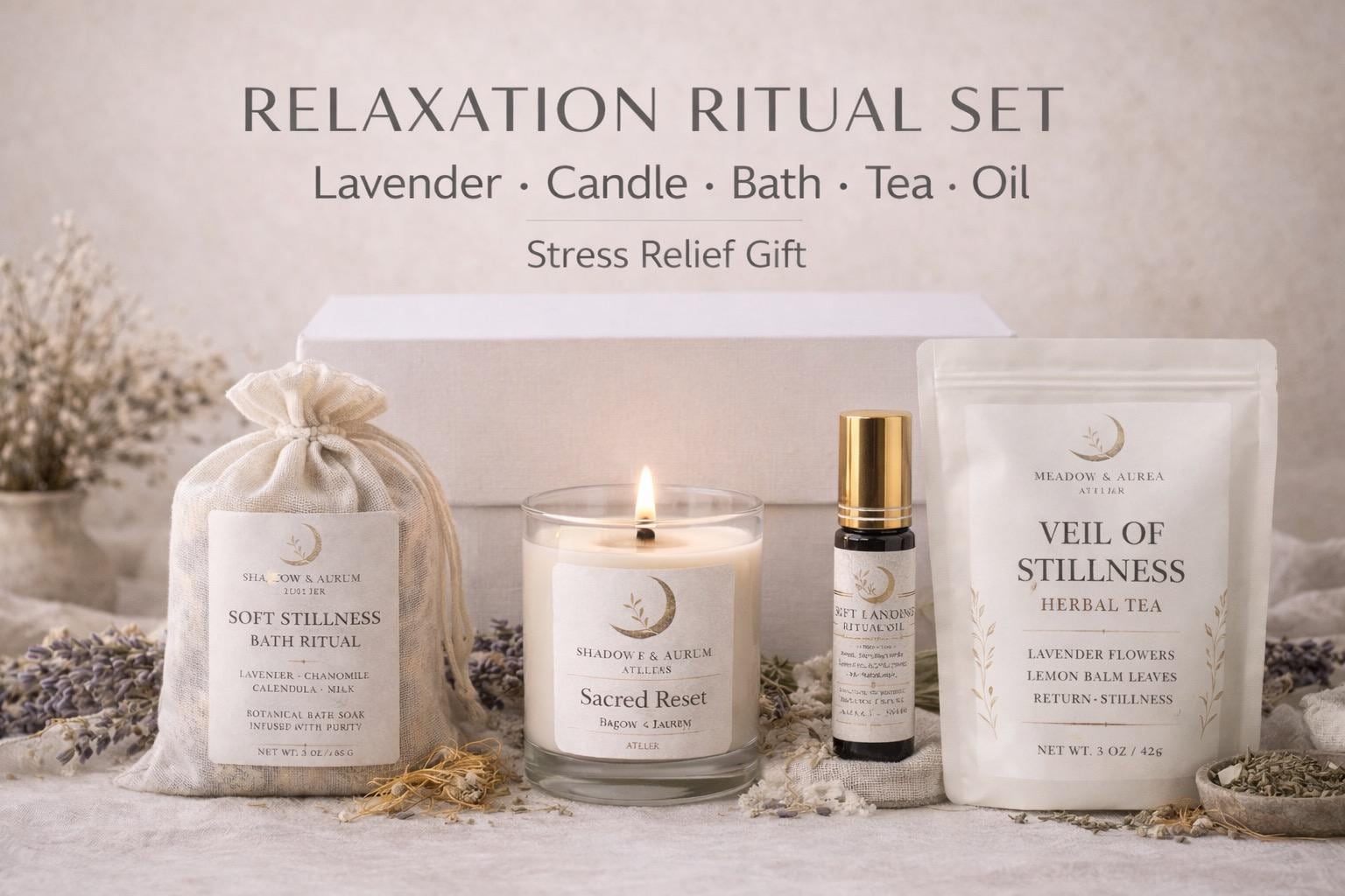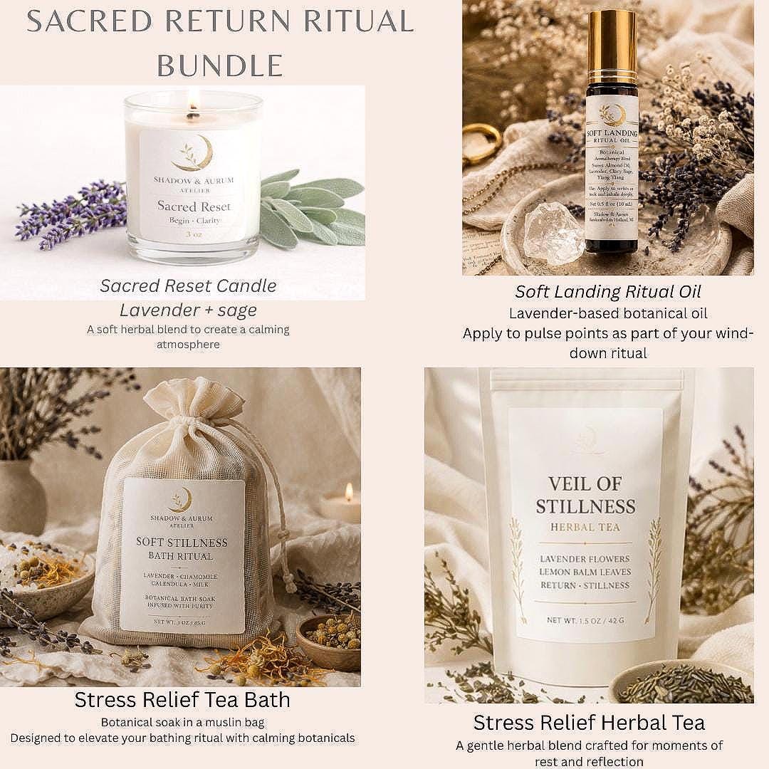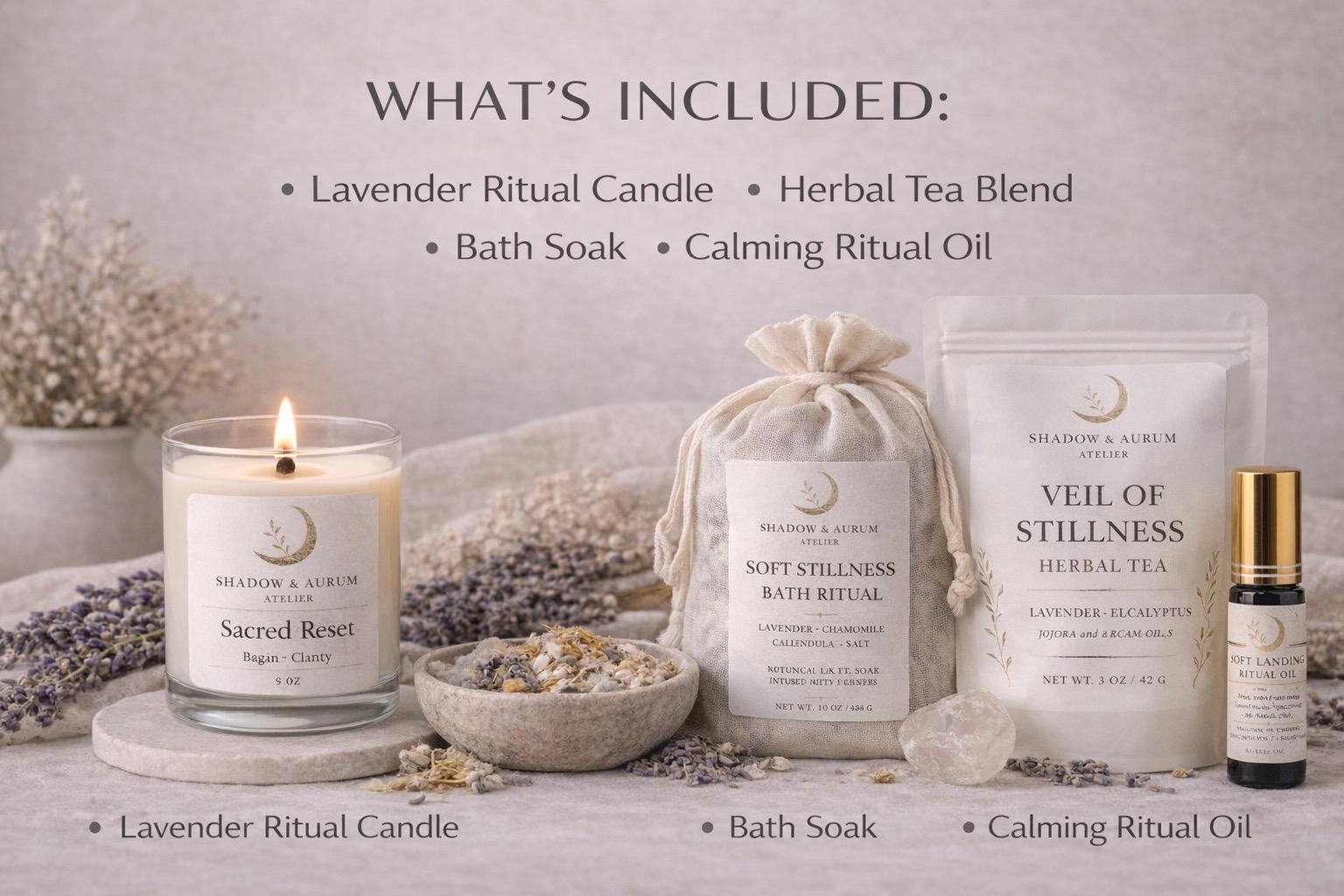 Sacred Reset Ritual Set | Lavender Candle, Herbal Tea, Bath Soak, Calming Oil