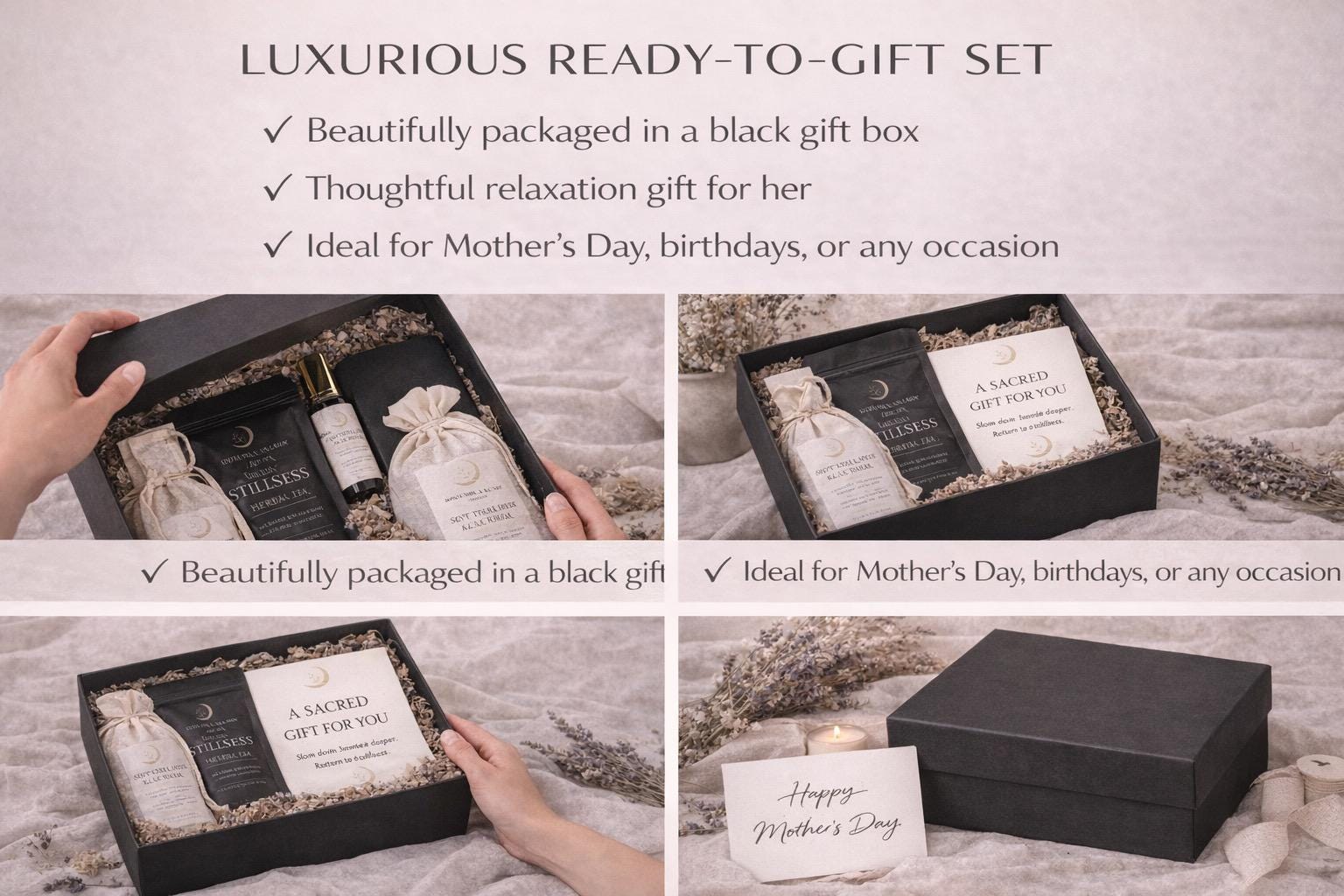 The Sacred Reset Ritual Set is a complete relaxation experience designed to help you unwind, release tension, and create a moment of stillness β whether for yourself or someone you love.