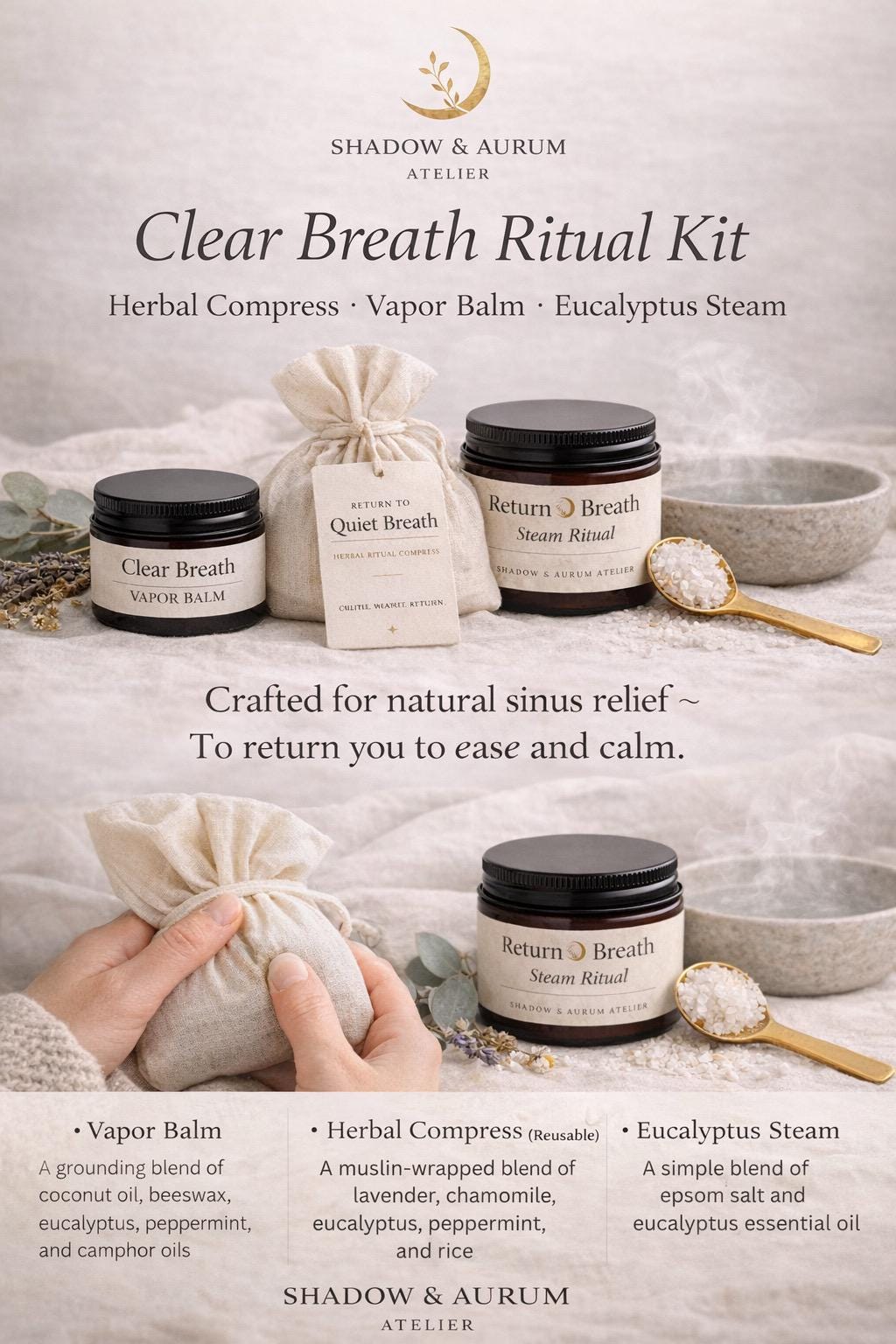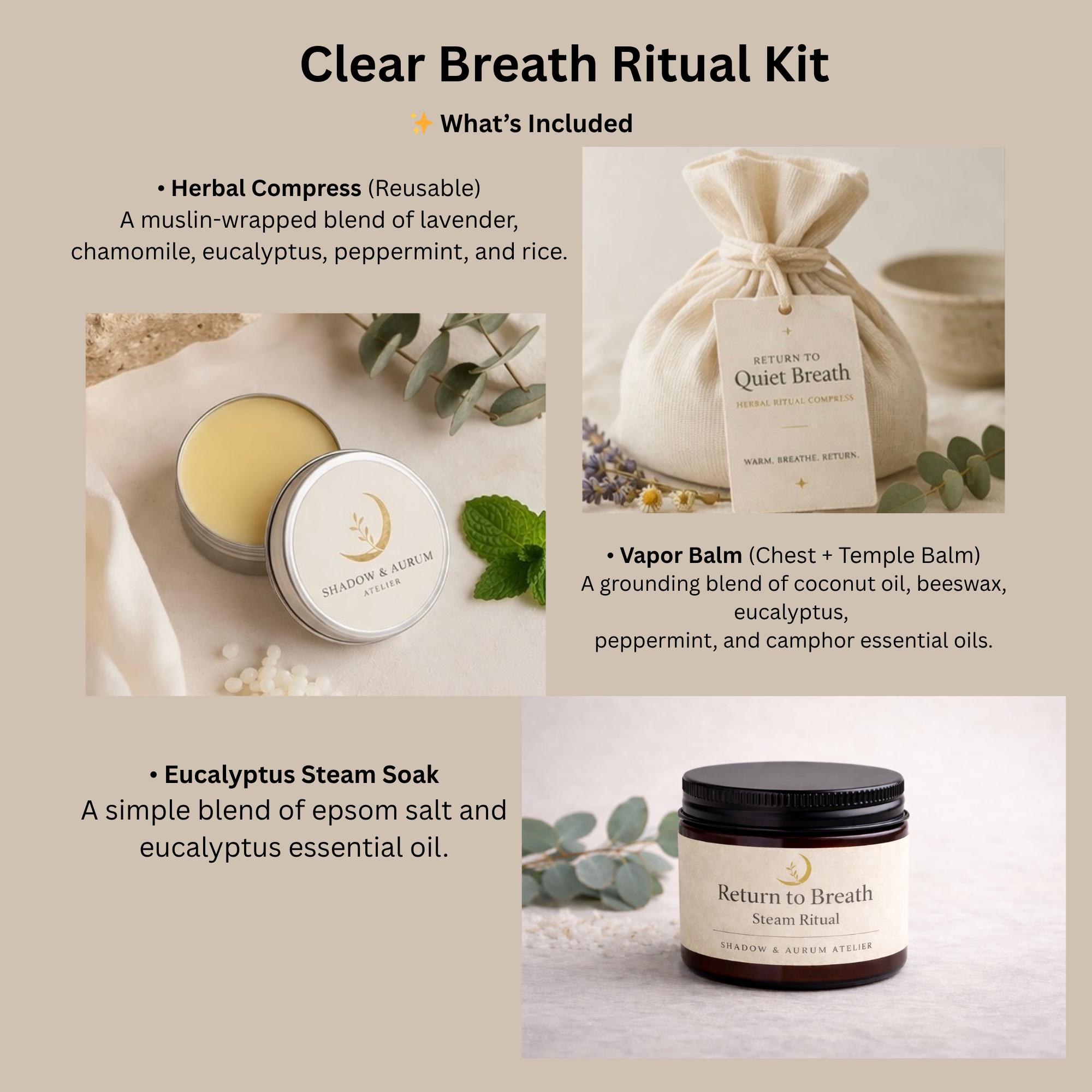The Clear Breath Ritual Kit by Shadow & Aurum Atelier is a small-batch, sensory ritual designed to support moments of congestion, heaviness, or seasonal discomfort.