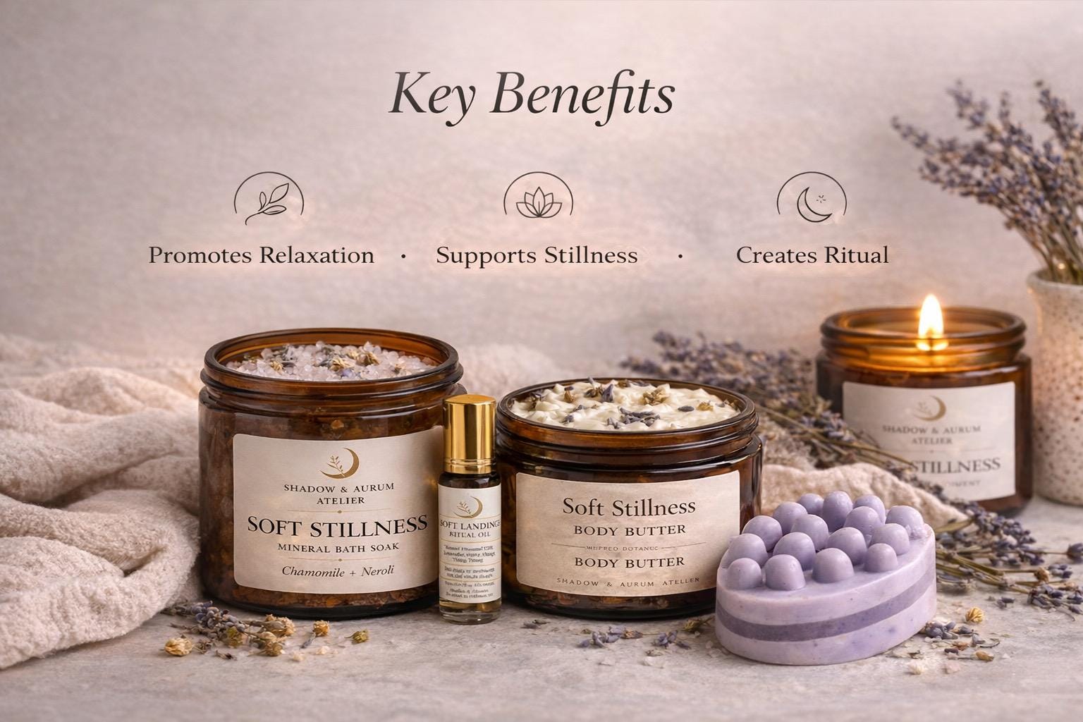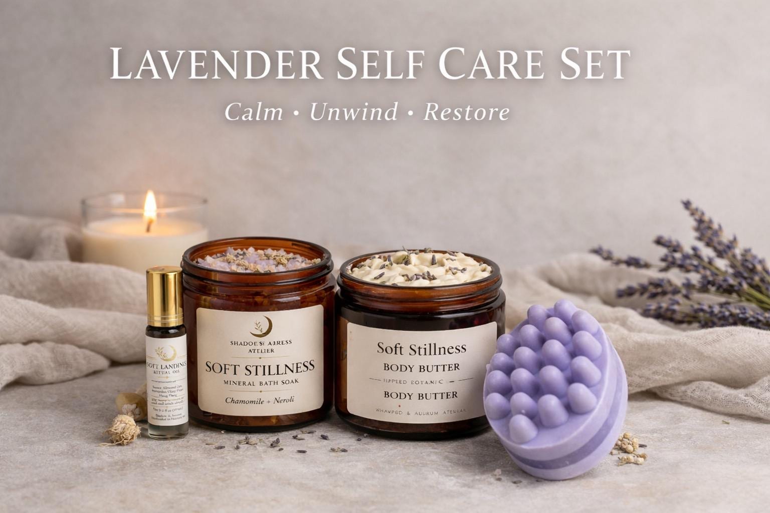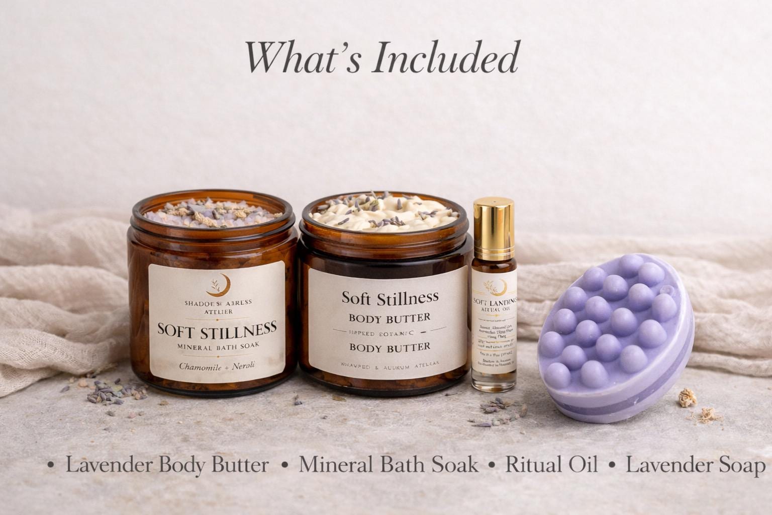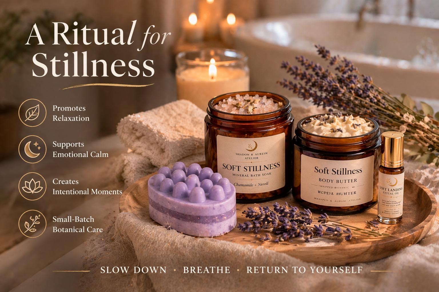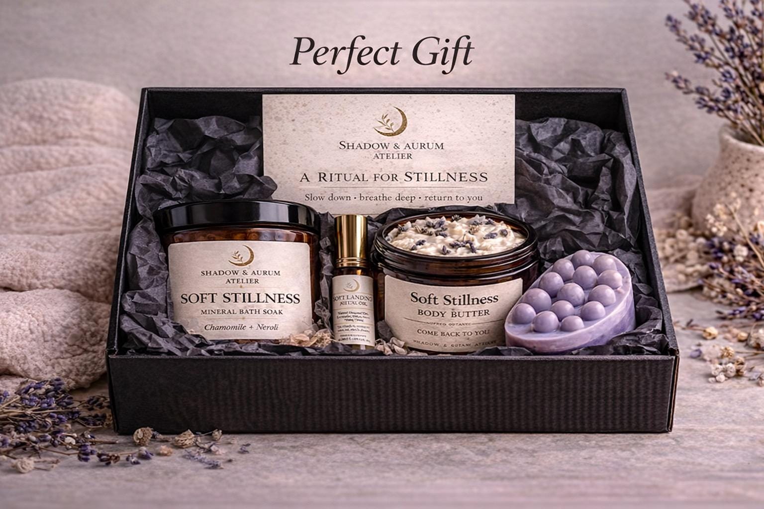 The Soft Stillness Ritual Set is a thoughtfully curated collection of small-batch botanical products created to support moments of rest, emotional reset, and gentle restoration. Perfect for evening rituals, stress relief, or as a meaningful gift for someone who needs a pause.