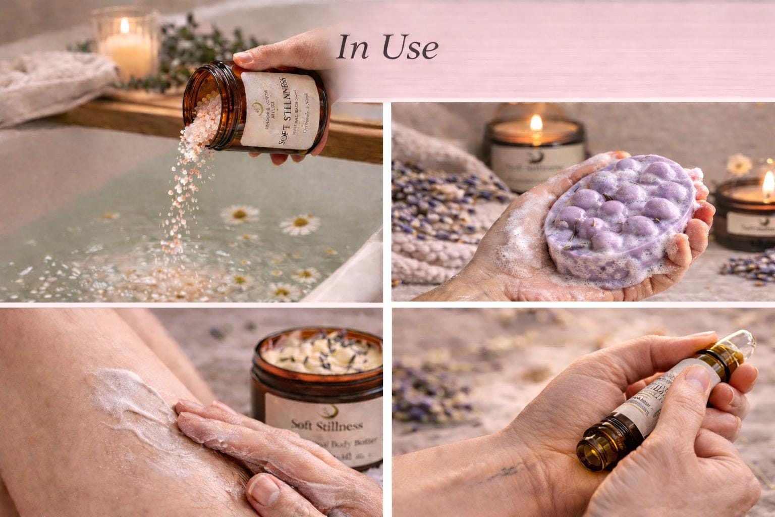 • Soft Stillness Bath Soak – calming mineral + botanical blend
